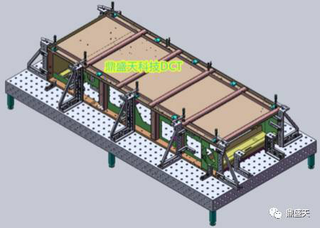 总装工装,是在一工序工装不改娈的前题下,一工序焊好后不用拆装,把底板组盖放到侧边框组上,从而完成整个机架的焊接。如下图所示: