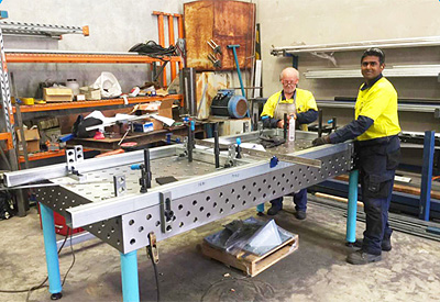 上图:同样用三维柔性平台配合气动夹具实现快速精准的装夹,减少焊接变形量,基准面用定位平尺定位,由于工件为铝制品,我们采用镀铬产品实现。