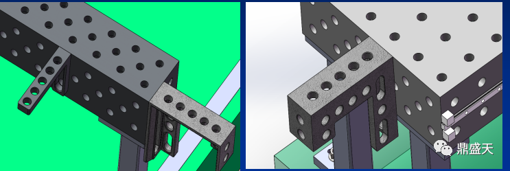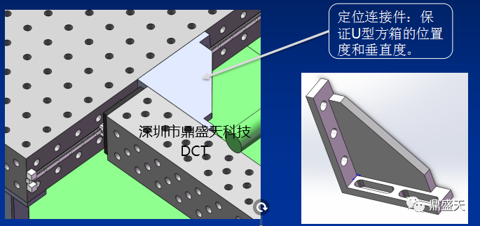 4、U型方箱和平台连接角铁和角尺等元件进行延申工作面。可在工装上增加定位检测元件,利用标准孔的位置进行设计定位元件,达到定位检测的用途。