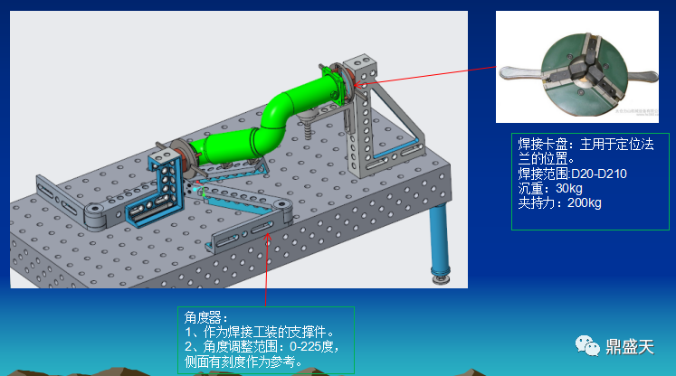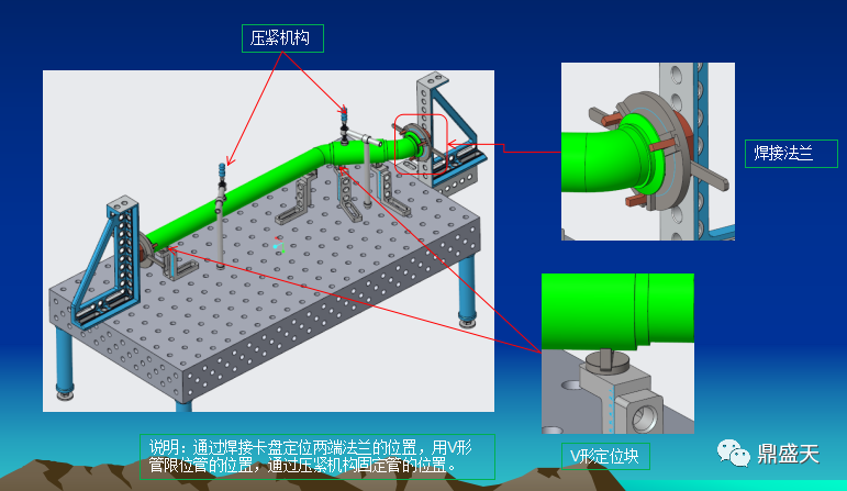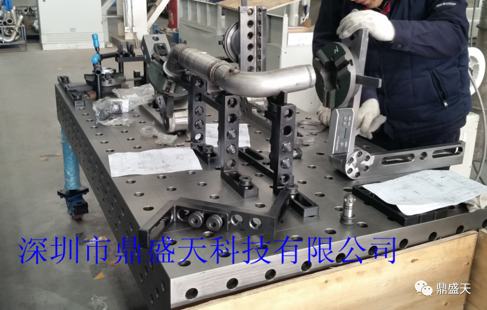 其主要保证产品的法兰位置精度.根据产品特性提供柔性焊接工装整体方案构思:根据客户产品特点及焊接要求,我司制作此套工装保证总体装配精度,抑制型变,工装拆取方便。工装本身的稳定性和一致性保障了产品的装配精度,达到焊接精度要求。通过调整焊接组合工装上的附件,满足同类型不同规格产品的焊接需求。