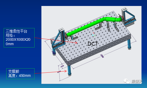 根据产品尺寸,基础平台选用我司2000*1000*200mmHT300灰口铸铁平台(平台平面度、平行度达±0.1/1000,侧面与上表面的垂直度达到 7 级精度±0.1/200)作为通用焊接工作台,平台支撑腿高度为450mm加上平台整体高度为650mm.在工作台上用压紧装置、锁紧装置及定位支撑装夹固定,以保证其焊接精度要求。