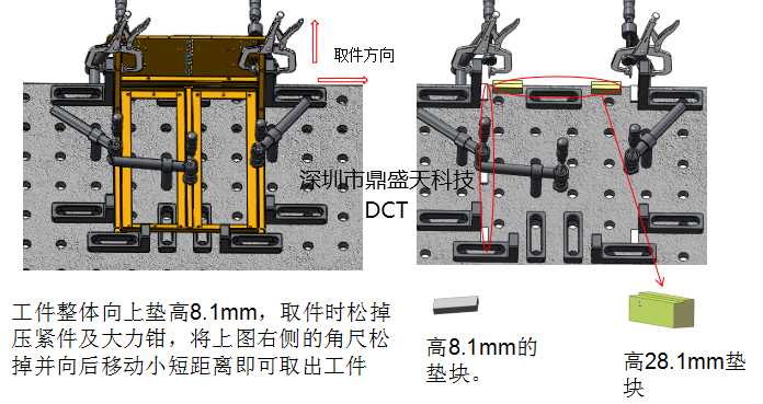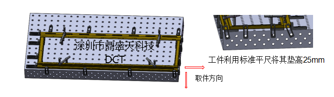 工件首次以平台的两侧作为定位基准,利用平尺进行支撑,辅以压紧件进行压紧防止焊接变形,取件时都是松掉平台侧边的平尺使其自动滑落,并由此两侧取件。